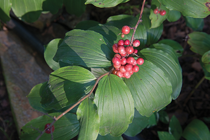 False Solomon’s Seal (Maianthemum racemosum). Although not in the same genus as true Solomon’s seals, this close cousin is a North American native with the look and grace of Polygonatum biflorum. The two are sometimes found paired in the wild, meaning it also thrives in similar growing conditions. So, what’s the difference? Instead of bell-like flowers hanging from under the stems, false Solomon’s seal shows off feathery bloom clusters on the tips of its limbs. These blossoms give way to red berries that can ripen to a bright red, but, personally, I usually don’t see them in such a hot hue — the birds in my garden eagerly gobble up the maturing fruits!