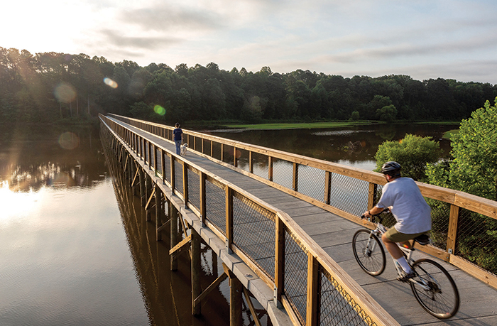 Starting at Fred G. Bond Metro Park, the White Oak Creek Greenway traverses winding boardwalks, abundant greenery and a beautiful wetland area (near Green Level Church Road) in west Cary. Best of all, it’s mostly flat and suitable for riders of all abilities.