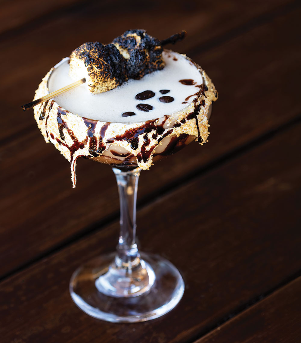“The Toasted S’mores Espresso Martini started it all,” says Self. The drink starts with chocolate drizzle in the glass, marshmallow fluff on the rim, then topped with two marshmallows that are toasted in front of guests.