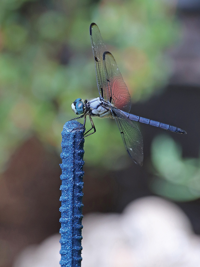 Dragonflies came. It wasn’t a constant fly-in, mind you, but seeing them frequently enthroned on top of the recycled rebar spikes gave me the satisfaction I was making mosquitoes and no-see-ums nervous, and as a bonus, I was bringing additional kinetic color into my garden, compliments of these pretty predators.