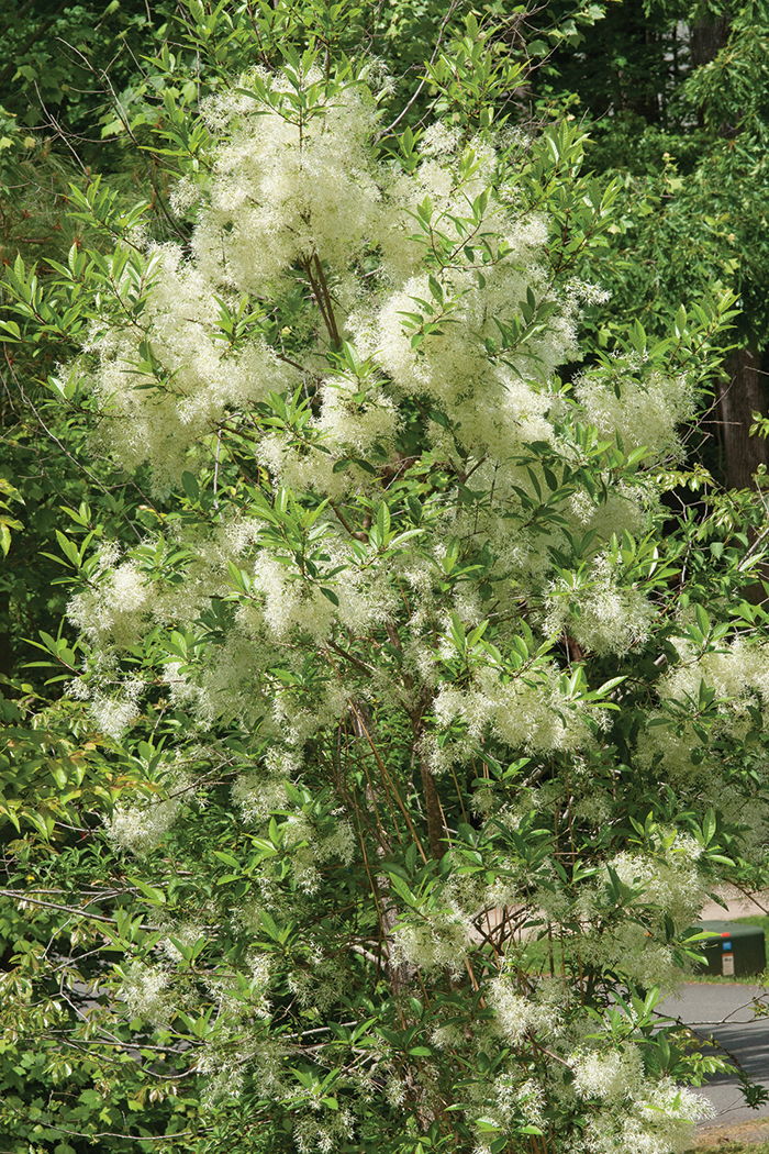 Fringe tree is alternately called “old man’s beard,” and the reason for both names becomes pleasantly apparent in the spring. Just as new, vibrant green leaves begin to appear, large fluffs of white, spritely blooms form, enveloping the tree in a feathery, fragrant cloud. This show for the nose and eyes usually starts in mid to late April and lasts about two weeks.